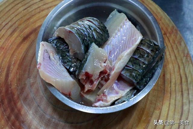准備宰殺干淨的草魚一條,沿著脊骨把魚片開,切掉魚頭,然後在魚身上劃上幾刀,把魚剁成均勻小塊放入盆中,倒入適量的清水,把魚塊上的血水洗干淨,瀝水備用。